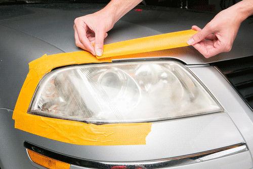 7- قبل البدء عليك ان تضع شريطا لاصقا على اطراف المصباح و احاطته بها بصورة دائرية للمحافظة على اطراف و طلاء السيارة من خشونة الورق الرملي.