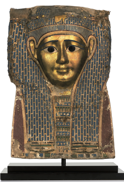 قناع لمومياء مصنوع من الكارتوناج مطلى بالذهب ومزخرف بألوان متعددة، يعود تاريخه إلى القرن الأول قبل الميلاد (نهاية الفترة البطلمية وبداية العصر الروماني). يقدر سعره ما بين 38,6 و64.4 ألف دولار.