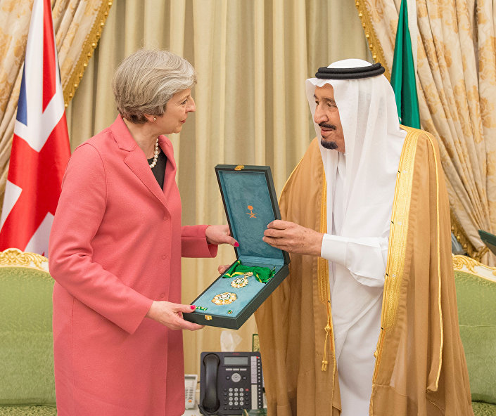 وحسب وكالة الأنباء الرسمية السعودية عقد الملك سلمان بن عبدالعزيز آل سعود، في قصر اليمامة بالرياض ، جلسة مباحثات رسمية مع رئيسة وزراء بريطانيا تيريزا ماي.
