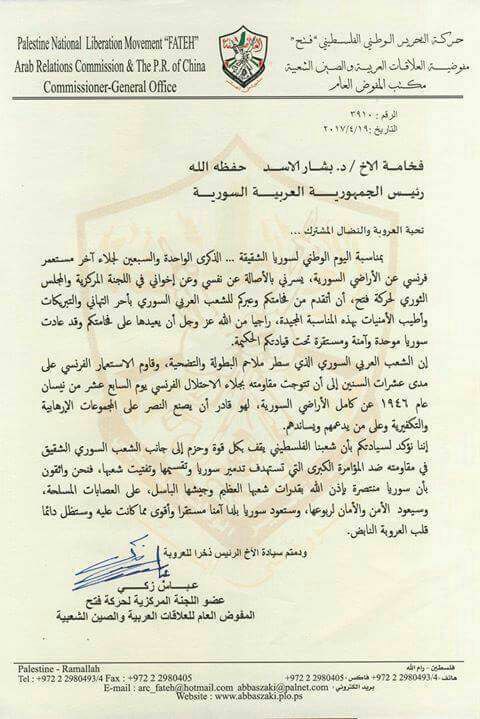 بيان صادر عن حركة فتح بمناسبة اليوم الوطني السوري