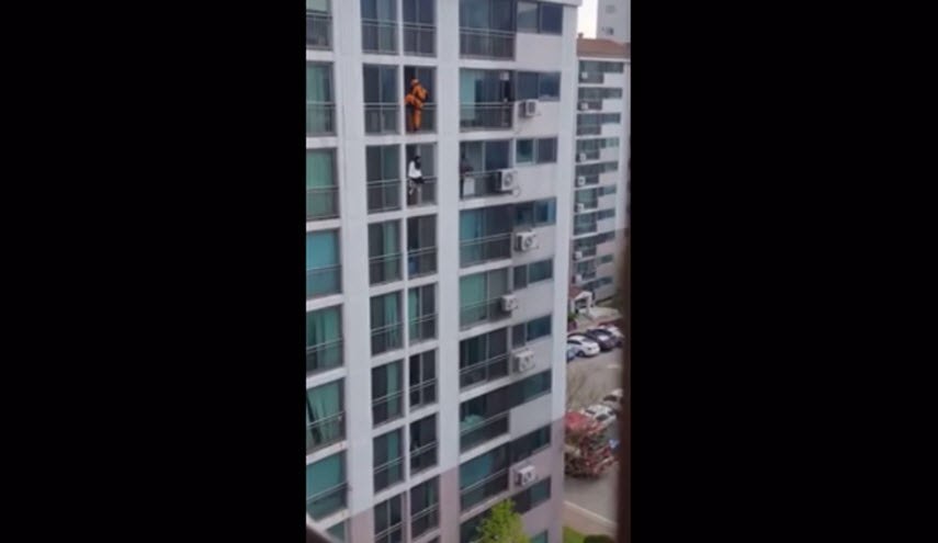 وفي حين اقترب رجل إطفاء، متشبثا بالسور، هبط فجأة دون أن يتردد في ركلها ليدفعها إلى الخلف داخل الشقة.