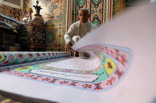 وعرض محمد المخطوطة التي تكسوها زخارف دقيقة ملونة في صندوق خشبي طويل وقام بتقليب الصفحات من خلال اسطوانتين في أعلى وأسفل الصندوق.