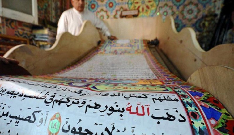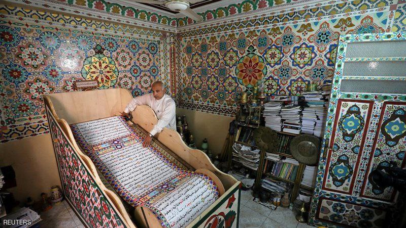 وحسب وكالة "رويترز"، نسخ سعد محمد، الذي تغطي جدران وأسقف بيته في قرية بلقينا بمحافظة الغربية شمالي مصر، الزخارف الإسلامية المرسومة باليد، القرآن على لفة ورق طولها 700 متر.