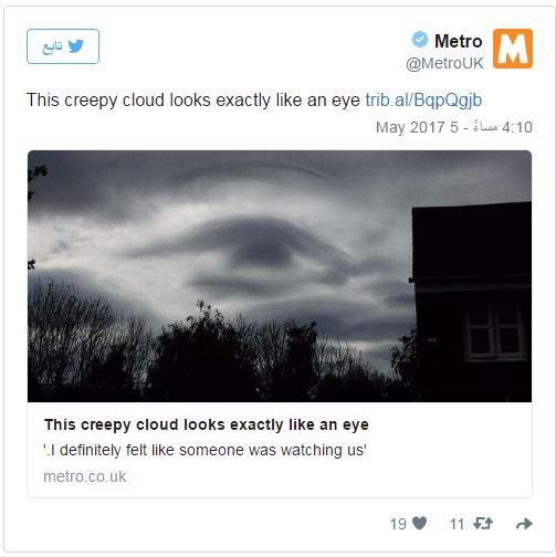 وعرض موقع "مترو" البريطاني الصورة التي التقطها تيلفورد، أظهرت تراكم السحب بشكل غريب في سماء مقاطعة يوركشاير شمال شرق إنجلترا، حيث شكلت السحب شكل عين بشرية عملاقة، ما أثار دهشة وتخمينات من شاهدوا الصورة.