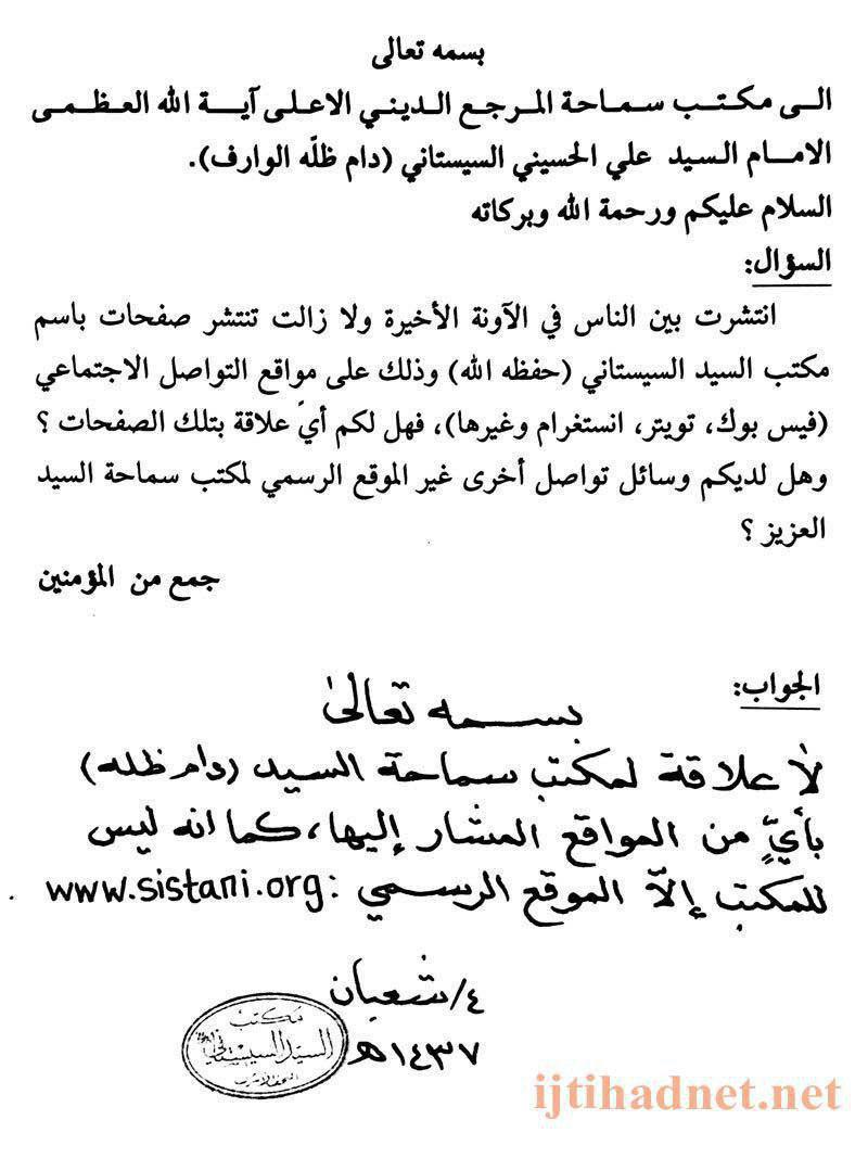 هذا وتنتشر صفحات على فيسبوك وتويتر وانستغرام تتحدث باسم مكتب المرجع السيستاني وهو ما دفع المكتب لاصدار بيان حول هذه القضية.