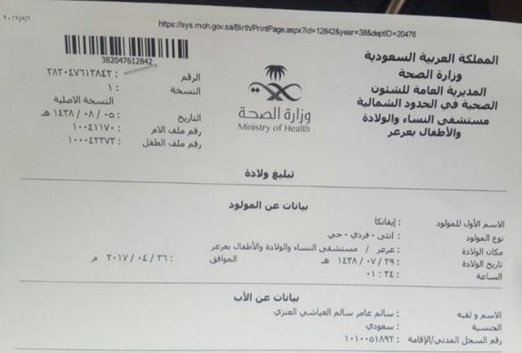 وكشفت الصورة التي تداولها مستخدمو مواقع التواصل الاجتماعي داخل السعودية، إطلاق أحد المواطنين في عرعر، اسم "إيفانكا" على مولودته، تيمنًا بابنة الرئيس الأميركي دونالد ترامب.
