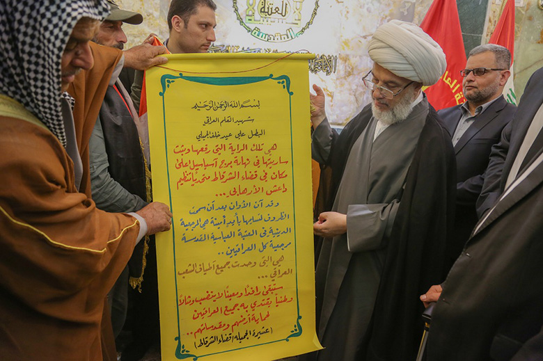 وفي ختام اللقاء سلم وفد عشائر الجميلات ممثل المرجعية الدينية الراية التي رفعها الشهيد علي الجميلي فوق برج للاتصالات في الشرقاط.