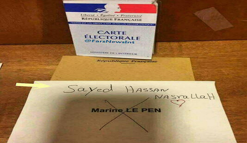 ومن خلال الصورة يتضح ان احد المواطنين الفرنسيين أدلى بصوته بكتابة اسم السيد نصر الله بدلا من كتابة اسم المرشحين الرئاسيين ماكرون أو لوبين.