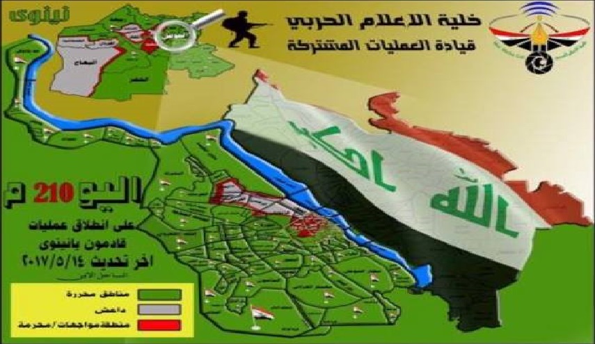 في المقابل، استحوذ اللون الأخضر الذي يمثل المناطق المحررة على الجزء الأكبر من الجانب الأيمن للموصل، بعد أن تم تحرير الجانب الأيسر بالكامل.
