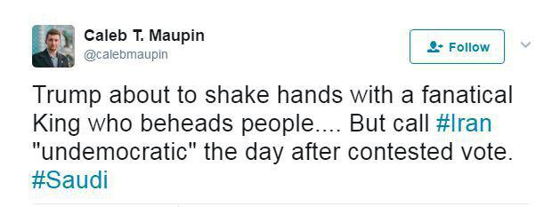 قال الصحفي الاميركي المعروف "Caleb Maupin" في تغريدة له على تويتر "ترامب يصافح ملكا متحجرا يفصل رؤوس الناس عن أجسادهم في حين أنه يصف إيران بـ"غير الديمقراطية" بعد يوم من إجراءها أكثر الانتخابات تنافسية!".