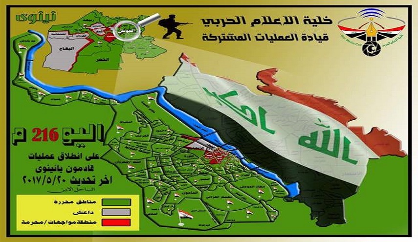 وتبين الخريطة ادناه ان ما تبقى من المناطق الخاضعة تحت سيطرة "داعش" هي جزء بسيط جدا، سيتم تحريرها بالايام القليلة المقبلة واعلان الموصل خالية من "داعش".