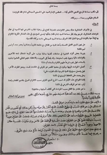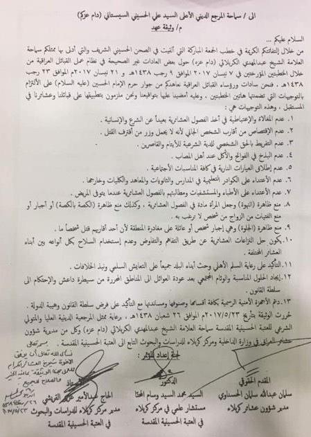تنشر وكالة السومرية نيوز، الثلاثاء، وثيقة المرجع الديني السيد علي السيستاني للعشائر بشأن النزاعات العشائرية والالتزام بها، فيما تضمنت الوثيقة الثانية تعهد سادات ورؤساء القبائل العراقية على الالتزام بهذه التوجيهات على القبائل والعشائر العراقية في المستقبل.