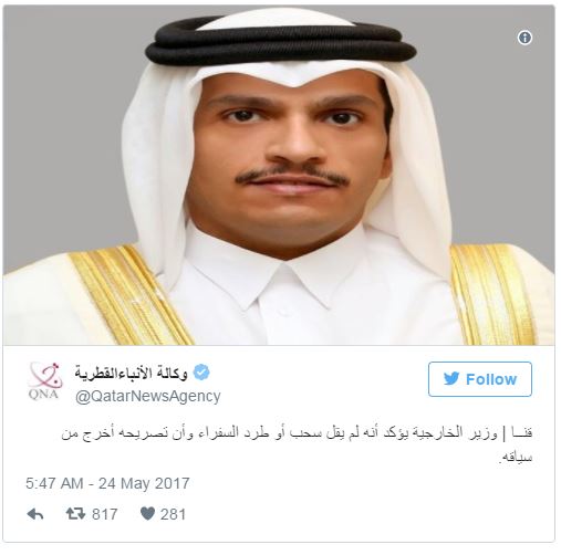 يذكر أن وكالة الأنباء القطرية "قنا"، قالت، في وقت سابق، إن وزير الخارجية القطري، أعلن سحب سفراء قطر لدى السعودية ومصر والكويت والبحرين والإمارات، وطلب قطر مغادرتهم هذه الدول خلال 24 ساعة.