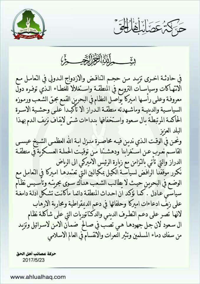 واكدت العصائب في بيانها أن تزامن هذه الاعتداءات مع زيارة الرئيس الامريكي دونالد ترامب إلى المنطقة يثبت زيف ادعاءات الغرب في دعمه للشعوب، في وقت تنتهك حقوق الشعوب على مرآى ومسمع منهم في الدول الحليفة لهم.