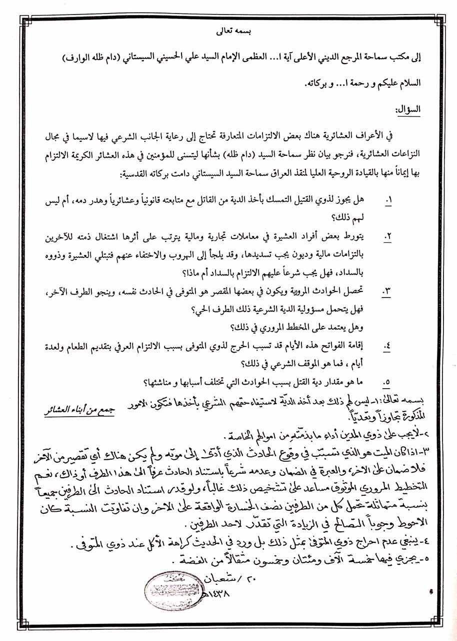 بعث مجموعة من المواطنين برسالة استفتاء شرعي حول بعض الاعراف العشائرية الى سماحة المرجع آية الله السيد على الحسيني السيستاني وكان جواب سماحته كما في الصورة...