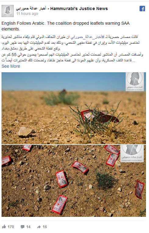 وأشارت صفحة "أخبار عدالة حمورابي"، التي تتابع أخبار التنسيق بين المجموعات المسلحة وقوات التحالف الدولي بقيادة واشنطن في الجنوب السوري، أشارت إلى أن المناشير تضمنت تحذيراً لعناصر الجيش السوري والقوات الرديفة بأنهم أصبحوا على بعد نحو 55 كم عن قاعدة التنف العسكرية، وأن عليهم العودة إلى نقطة حاجز ظاظا.