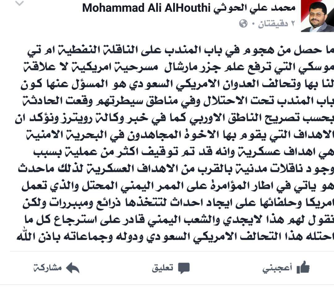 وذكر رئيس اللجنة الثورية العليا في صفحته على facebook ان “ما حصل من أقتحام في باب المندب على الناقلة النفطية ام تي موسكي التي ترفع علم جزر مارشال هي مسرحية امريكية لا علاقة لنا بها.