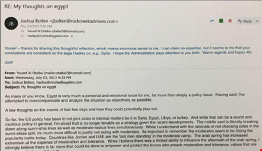الرسالة التي يتحدث فيها العتيبة عن مصر بعد الإطاحة بمرسي وجماعة الإخوان المسلمين