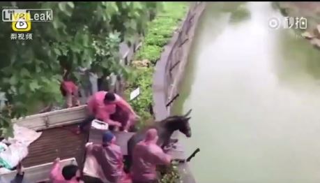 كان الحمار يحاول التملص من العمال الذين كانوا يرتدون زي الأمطار ودفعوه بلا مبالاة في المياه يلقى مصرعه.