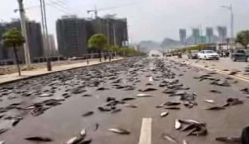 وأظهر مقطع الفيديو، الأسماك تملئ الشوارع التي سقطت من السماء على الشاطئ والشوارع المحيطة.