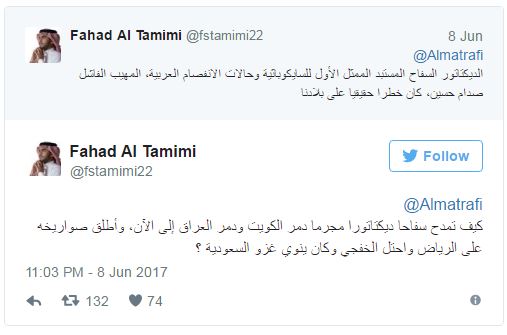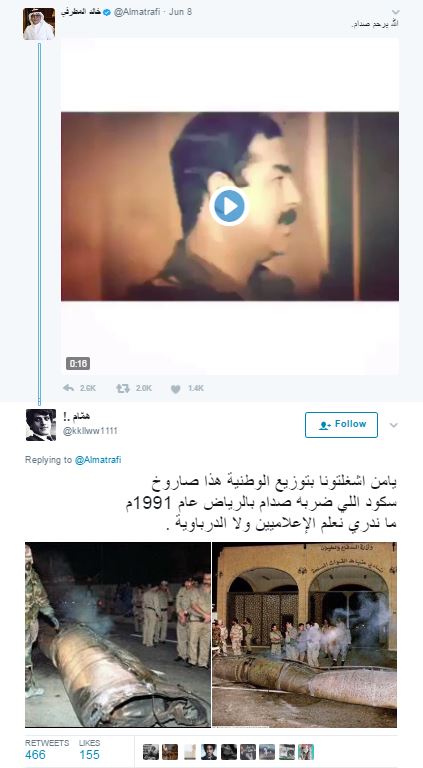 ردود الفعل على الفيديو جاءت "بعكس ما تشتهي السفن"، بعد أن كان يهدف مهاجمة قطر ويحرض السعوديين على مهاجمتها، شن سعوديون هجوما كبيرا عليه، مستنكرين استشهاده بصدام الذي يعتبره الكثير من السعوديين بـ"الغازي".