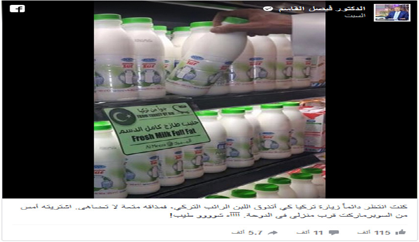 وقام مذيع قناة "الجزيرة" القطرية المثير للجدل "فيصل القاسم"، بمشاركة منشور على صفحته على موقع التواصل الاجتماعي "فيسبوك"، تحدث فيه عن استمتاعه بمذاق اللبن الرائب التركي.