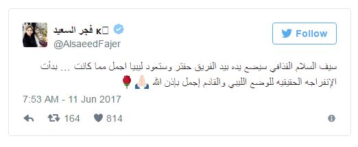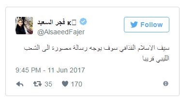 وكانت الصحفية الكويتية فجر السعيد قد نشرت تغريدة على حسابها في موقع التواصل الاجتماعي تويتر قالت فيها إن سيف الإسلام سيوجه قريبا رسالة مصورة لمواطنيه.