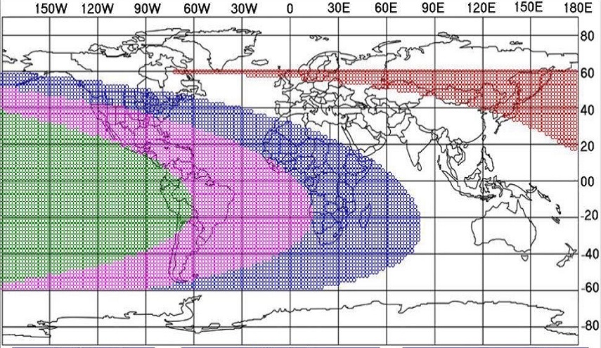 · رؤية الهلال ممكنة فقط باستخدام التلسكوب من المناطق الواقعة في اللون الأزرق.