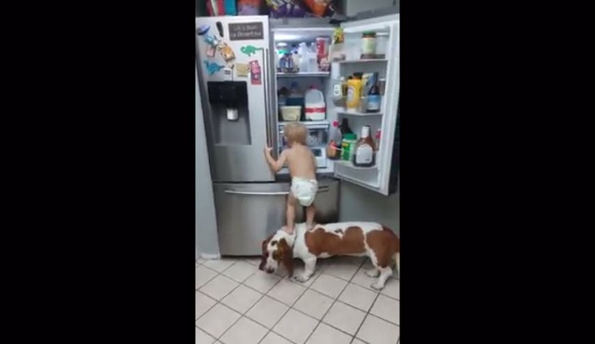 ظهر الكلب في بداية الفيديو يقف على الأرض في وضع ثابت، حتى يتمكن الطفل من الصعود وفتح الثلاجة للبحث عن الطعام. حقق الفيديو أكثر من 60 مليون مشاهدة، وأشاد المستخدمون بالعمل الجماعي بين الكلب والطفل، بينما شعر آخرون بالقلق على سلامة الطفل، خاصة أن الكلب انسحب في نهاية الفيديو وترك الكلب معلقا في الهواء.
