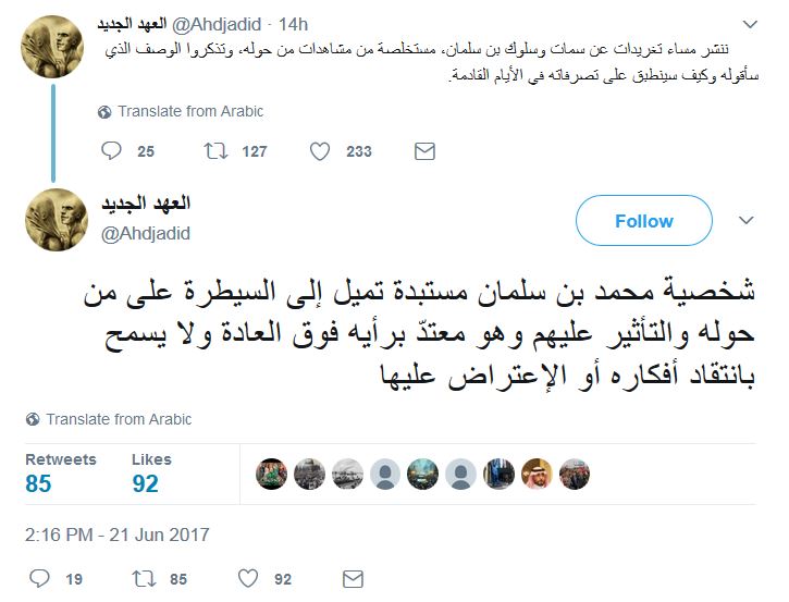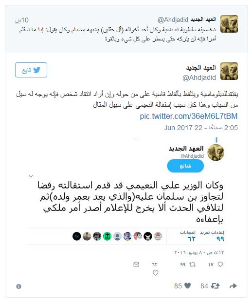 وكان “العهد الجديد” الذي يُعرّف نفسه بأنّه “راصد قريب من غرف صناعة القرار”، قد سرب خبر انقلاب محمد سلمان وإقالة بن نايف، وأن الأخير قَبِلَ التنحي لقاء “صفقة مالية عملاقة” .