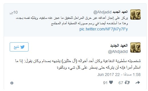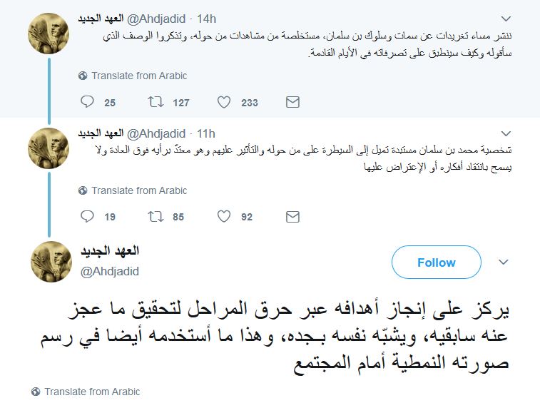 ونشر “العهد الجديد”، سلسلة تغريداتٍ عن سمات وسلوك محمد بن سلمان، مستخلصة من مشاهدات من حوله.