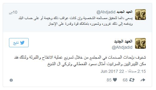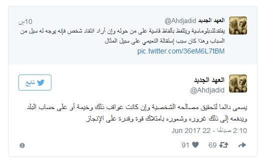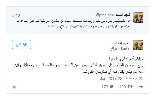 ووجّه الحسابُ تحذيراً للسعوديين من قادِم الأيام في عهد ولاية محمد بن سلمان قائلاً:”جيتكم أيام تذكروها جيدا ..راح تشوفون الظلم وأكل حقوق الناس ومزيد من التقشف وسوء الخدمات وسرقة البلد وابن أمه ألي يقدر يفتح فمه أو يعترض على شي”.