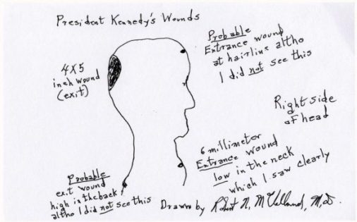 ورسم الدكتور ماكليلاند، في وقت لاحق رسمًا يدويًا يصور الجانب الأيمن من رأس كينيدي، وأشار إلى الجروح التي خلفها مكان دخول وخروج الرصاص، والتي كان يعتقد أنها أطقلت عن طريق القاتل الوحيد لي هارفي أوزوالد.