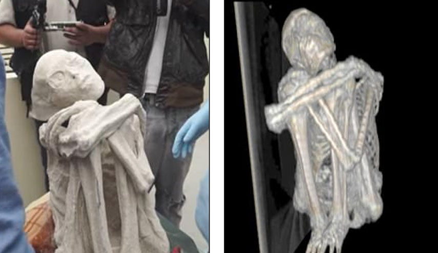 ويقول خبراء نظرية المؤامرة إنهم وجدوا "إنسانا محنطا" غامضا بـ 3 أصابع، وجمجمة غريبة الشكل. ولكن النتيجة لم تُقنع الجميع، حيث قال أحدهم، إن النموذج المقدم مجرد تمثال من الجص.