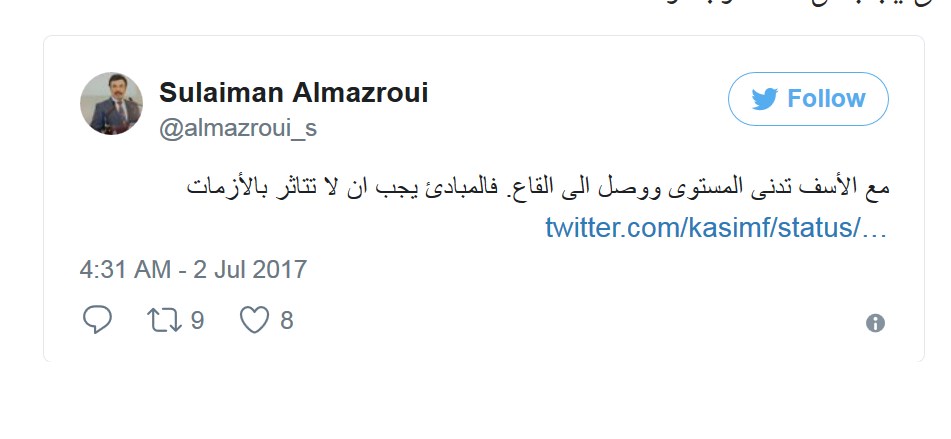 من جهته رد السفير الإماراتي في بريطانيا، سليمان المزروعي، بالقول:” مع الأسف تدنى المستوى ووصل الى القاع. فالمبادئ يجب ان لا تتاثر بالأزمات”.