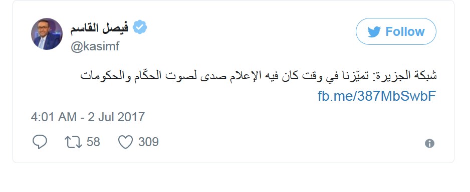 وكان القاسم قد غرد عبر حسابه على موقعر “تويتر”، بالقول: ” شبكة الجزيرة: تميّزنا في وقت كان فيه الإعلام صدى لصوت الحكّام والحكومات”، على حد تعبيره.