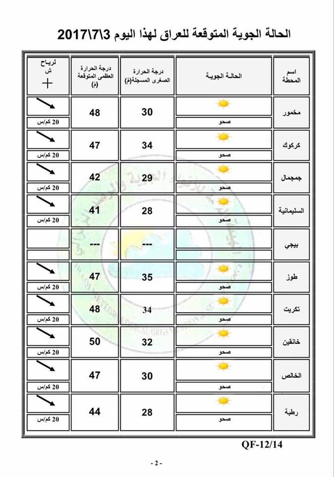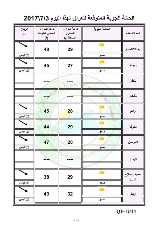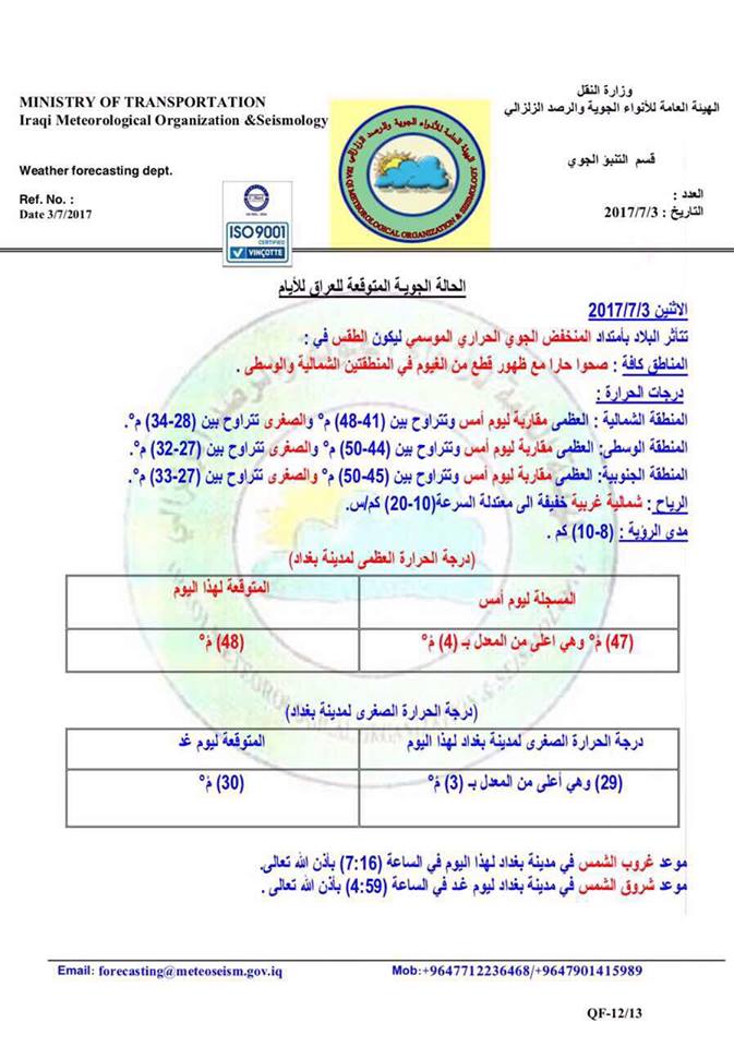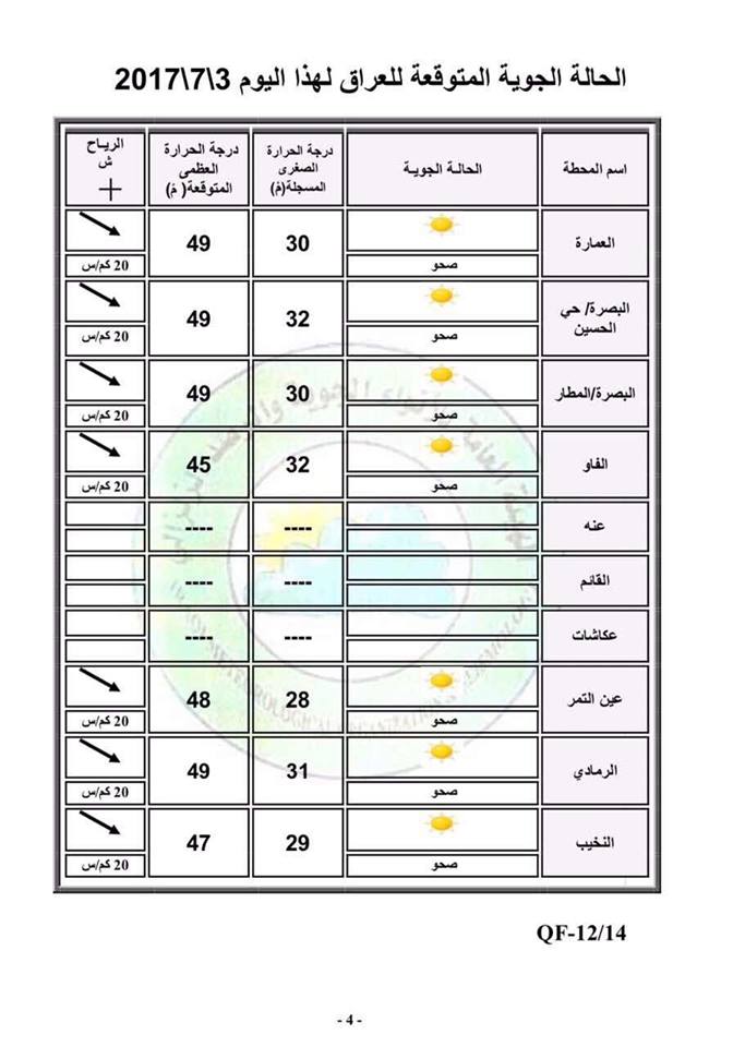 واشارت الهيئة في بيان لها، اليوم (3 تموز 2017)، إلى أن البلاد ستتأثر في الأيام الأربعة المقبلة بامتداد المنخفض الجوي الحراري الموسمي ليكون الطقس في المناطق كافة صحوا حارا مع ظهور قطع من الغيوم في المنطقتين الشمالية والوسطى، مع اقتراب درجات الحرارة في مناطق الوسط والجنوب، إلى نحو 50 درجة مئوية.