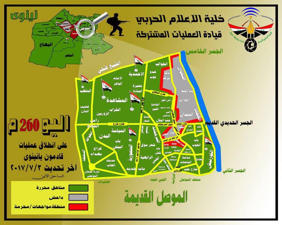وتظهر الخريطة حسب ما نشرته الخلية، اليوم (3 تموز 2017)، المناطق المستعادة من سيطرة تنظيم داعش منذ انطلاق عمليات استعادة الجانب الايمن من الموصل في 19 من شباط الماضي.