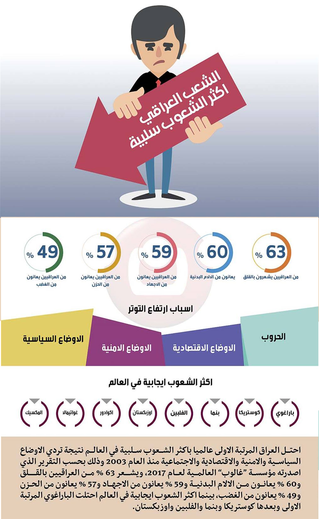 وذلك بحسب التقرير الذي اصدرته مؤسسة “غالوب” العالمـــية لعـــام 2017، ويشــعر 63 % من العراقيين بالقـــــــلق و60 % يعانون من