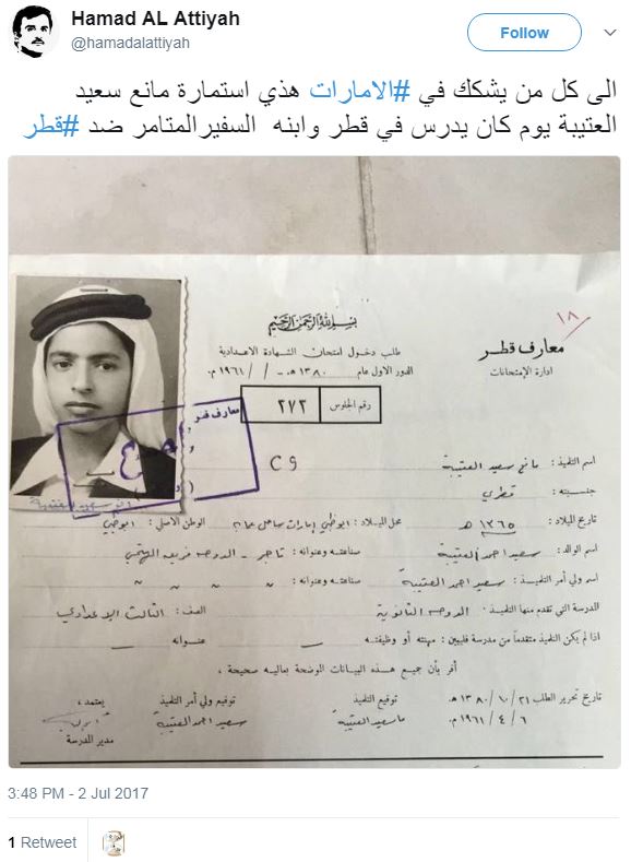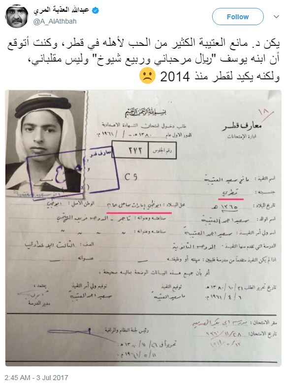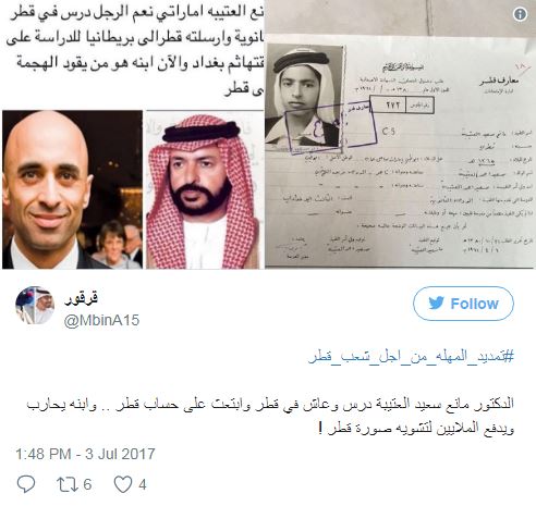 و فقد تبين وثائق نشرها إعلاميون قطريون، أن والد السفير الإماراتي بواشنطن، حاصل على الجنسية القطرية، وتم ابتعاثه إلى لندن، وبغداد لإكمال دراسته الأكاديمية، على نفقة الدوحة.