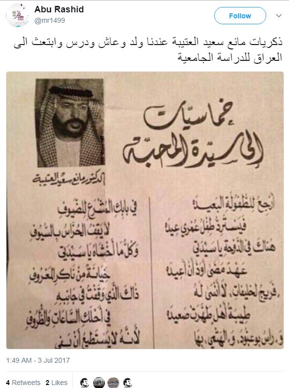 ونشر ناشطون أبياتا شعرية قديمة لمانع العتيبة، يحنّ فيها إلى الفترة التي عاشها في قطر، ويحذر من نكران المعروف، قائلين إنه قصد ابنه دون علم في الأبيات، وفق قوله.
