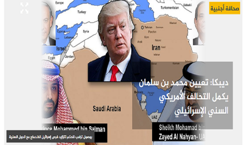 كذلك اعتبر موقع "ديبكا" الإسرائيلي، أن تعيين محمد بن سلمان يكمل التحالف الأمريكي السني الإسرائيلي، ورأى الموقع العبري في تحليله أن الدمج بين امريكا والسعودية والإمارات ومصر و"إسرائيل"، هو الأساس لتفاؤل الرئيس ترامب، إذ بات بالإمكان التقدم نحو حل للصراع الإسرائيلي- الفلسطيني، وإقامة علاقات أكثر انفتاحا بين الدول العربية المعتدلة و"إسرائيل"، متوقعاً أن تأتي الخطوة الأولى عبر الكشف العلني عن جزء من العلاقات السرية الجارية اليوم.