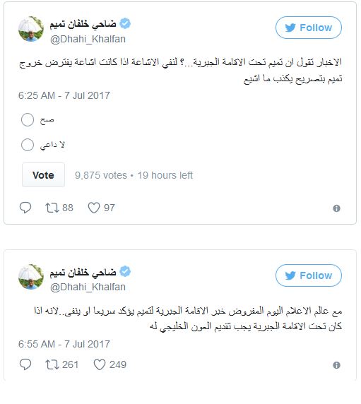 وذكر خلفان أن معلومات تناهت إليه بأن تميم بن حمد قيد الإقامة الجبرية، ودعا إلى التأكد من النبأ لتقديم عون خليجي له.