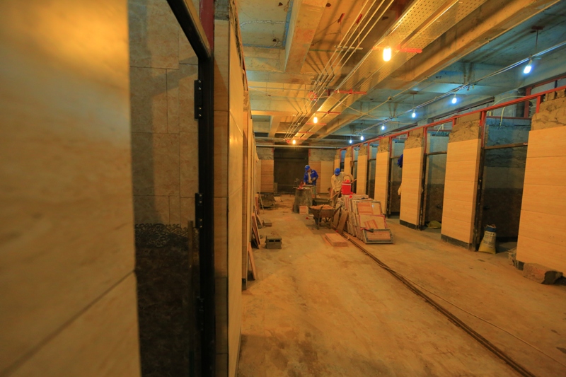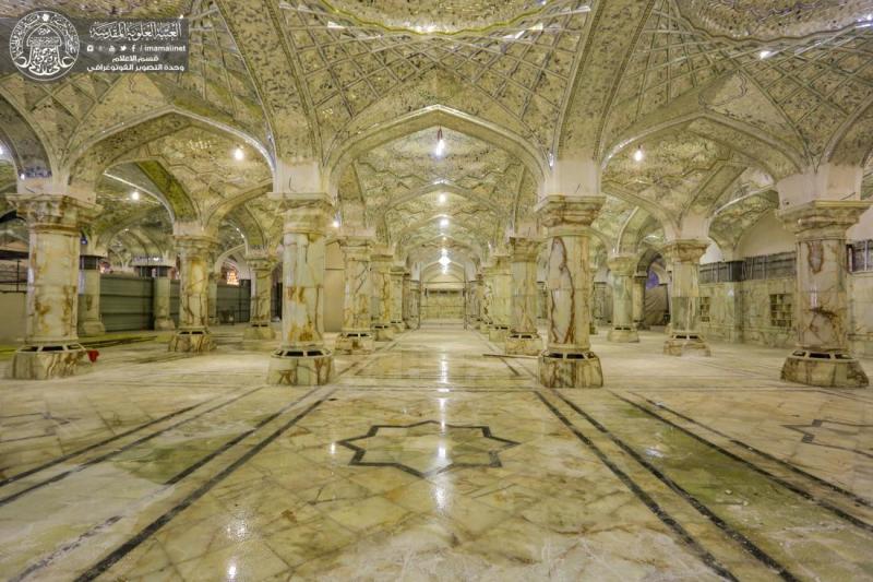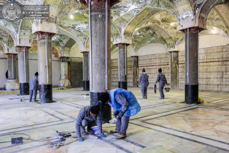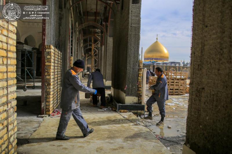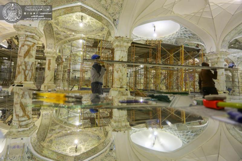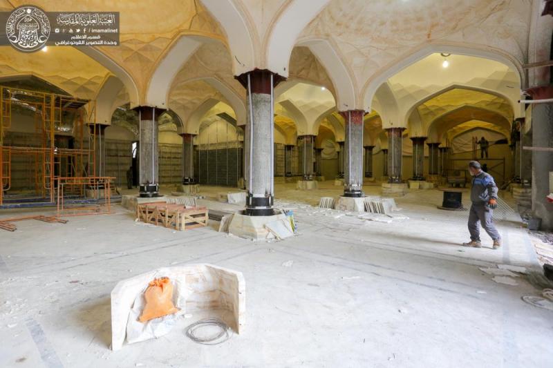 وأضاف" كما يتواصل العمل في الأرجاء الخاصة بجزء الزيارة والعبادة ومنها الاستمرار بالقباب الجبسية بشقيها (الأعمال اليدوية، والقوالب الجاهزة، مع استمرار العمل في الجوانب المعمارية والتأسيسات مع الاستمرار بأعمال التسطيح للجزء العلوي في الجزئين الشمالي والجنوبي، واستمرار العمل في انجاز الارضيات للجهة الجنوبية من الجزء بمادة المرمرالخالص".