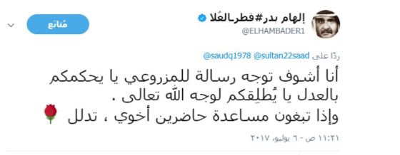 وفي ردها على أحد المغردين السعوديين الذي اتهم أمير قطر الشيخ تميم بن حمد آل ثاني بالمسؤولية عن تصعيد الازمة لعدم تنفيذه مطالب الدول الـ13، قالت “بدر”: “ أنا أشوف توجه رسالة للمزروعي يا يحكمكم بالعدل يا يُطلِقكم لوجه الله تعالى . وإذا تبغون مساعدة حاضرين أخوي ، تدلل”.