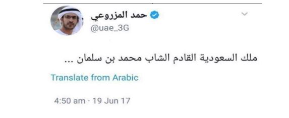 وكان “المزروعي”، وهو رجل يقول الإماراتيون إنه رجل أمن مقرب من ولي عهد أبوظبي محمد بن زايد، ويعبر على الدوام عن وجهة نظر الإمارات، كما أن تعليقاته هي ما تود الإمارات دوما نشره بصورة غير رسمية، قد قال في تغريدة له نشرها قبيل تعيين محمد بن سلمان وليا للعهد بيومين، قال فيها: ” ملك السعودية القادم هو الشاب محمد بن سلمان”، وهو الامر الذي يعكس مدى الاختراق الذي تعاني منه السعودية من قبال أولاد زايد ورجالهم.