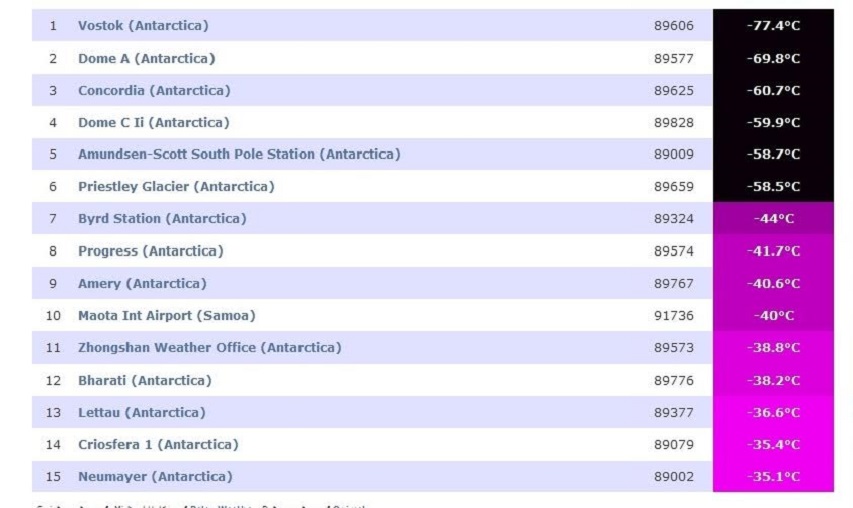 اما بالنسبة للمناطق الاكثر برودة فقد احتلت منطقة فوستوك في القارة القطبية الجنوبية الاكثر برودة بالعالم بدرجة حرارة 77.4درجة مئوية تحت الصفر، تليها منطقة دوما أي في القارة القطبية الجنوبية ايضا بدرجة حرارة تبلغ 69.8 درجة مئوية تحت الصفر.