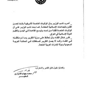 وأعرب نائب الوزير عن قلقه من أن يقوم الأمير السعودي محمد بن سلمان بأعمال مع تنظيم القاعدة والجماعات المتطرفة الأخرى دون التنسيق مع الأمريكان، كما أعرب نائب الوزير عن استياء الولايات المتحدة الأمريكية بشأن تمدد وتوسع القاعدة في اليمن والدول المجاورة.