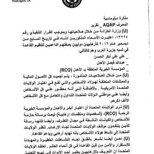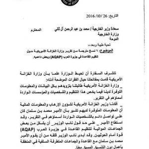 ووفقا للوثيقة؛ فإن نائب وزير الخزانة الأمريكية لشؤون الإرهاب والمعلومات المالية أفاد بأن الأمير السعودي محمد بن سلمان وولي عهد أبوظبي محمد بن زايد كانا على تواصل دائم باليمنيين “علي أبكر الحسن” و” عبدالله فيصل الأهدل ” المدرجين ضمن قائمة العقوبات الأمريكية، لعلاقتهما الوثيقة بتنظيم القاعدة.