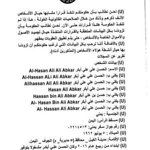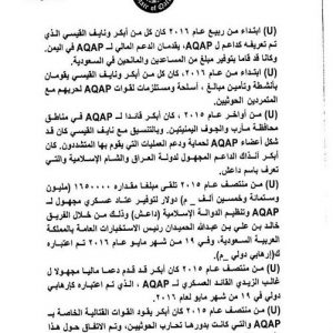 وتضمنت الوثيقة معلومات تفصيلية عن نشاطات كلا من: عبدالله بن فيصل الأهدل وعلي أبكر الحسن لدعم تنظيمي القاعدة وداعش، والتمويل المباشر الذي قدمه رئيس الاستخبارات السعودية خالد بن علي بن عبدالله الحميدان لعلي أبكر، وذلك لشراء عتاد مجهول وتقديمه إلى داعش.
